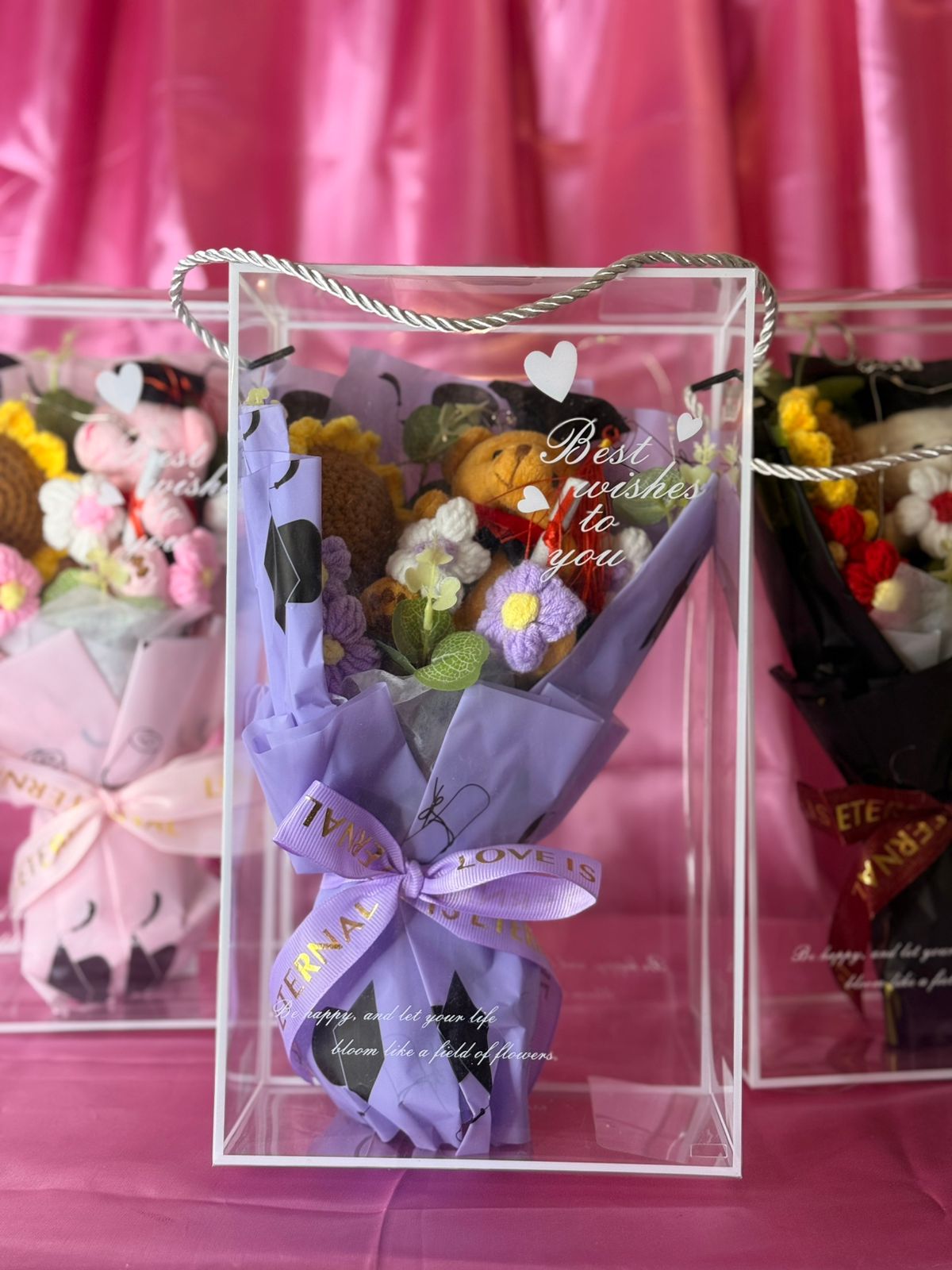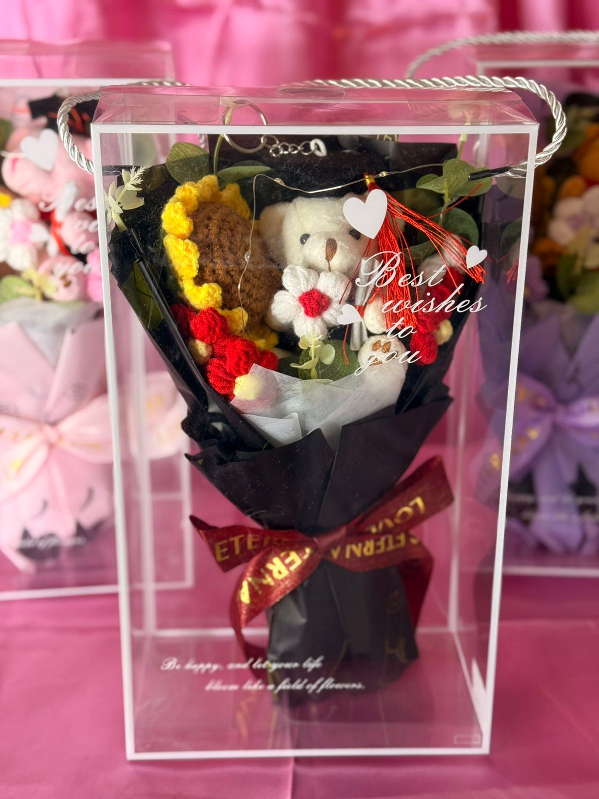 - Ramo de girasol y flores tejidas, con osito con traje de grado y luces